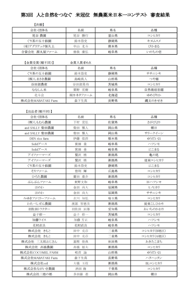 第3回 人と自然をつなぐ 米冠位 無農薬米日本一コンテスト 審査結果